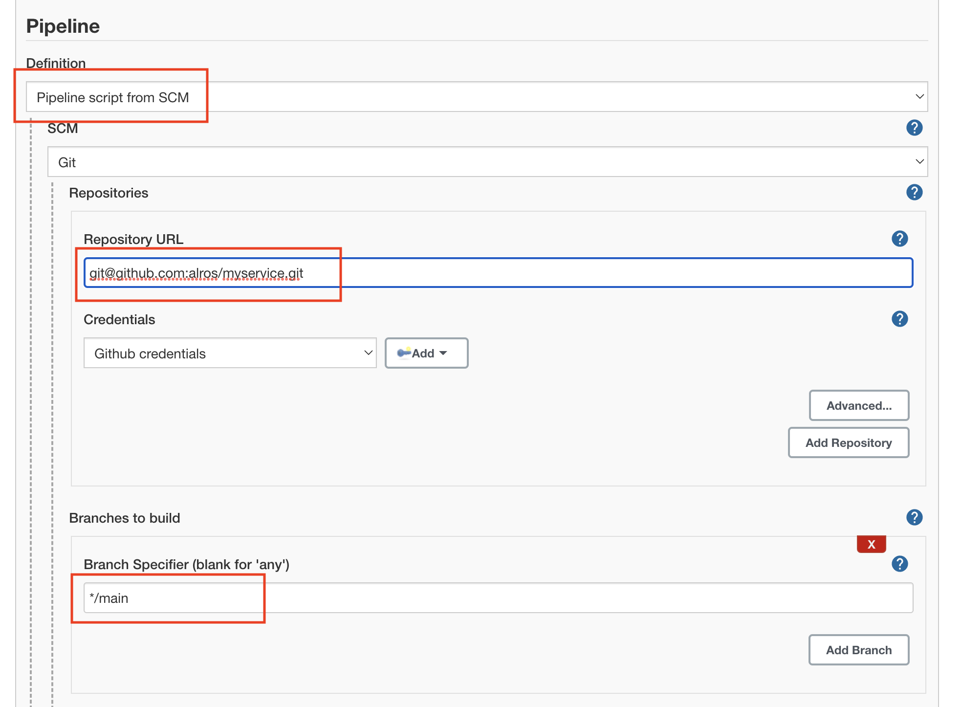 Open the configuration of the project’s build and scroll down to Pipeline to configure the branch to build.