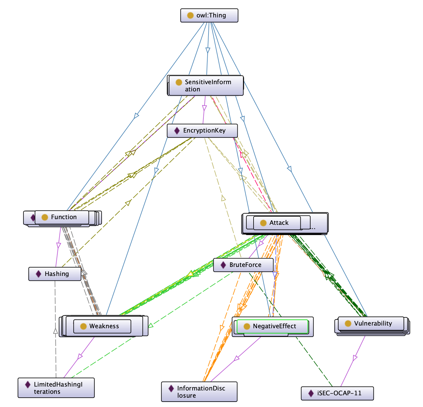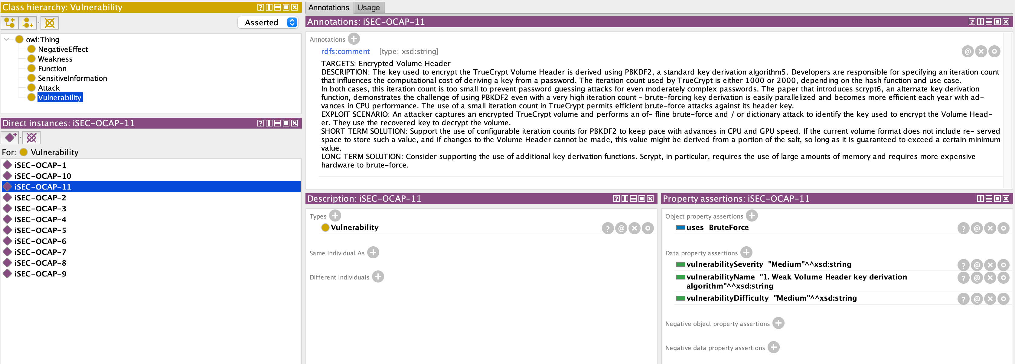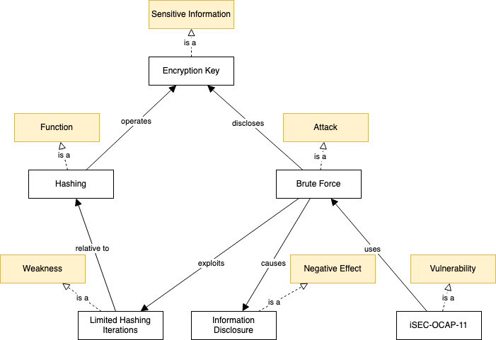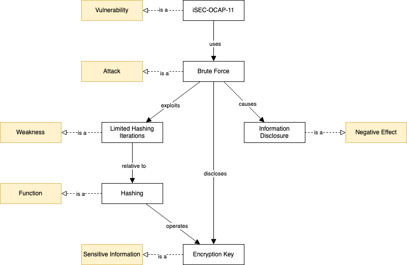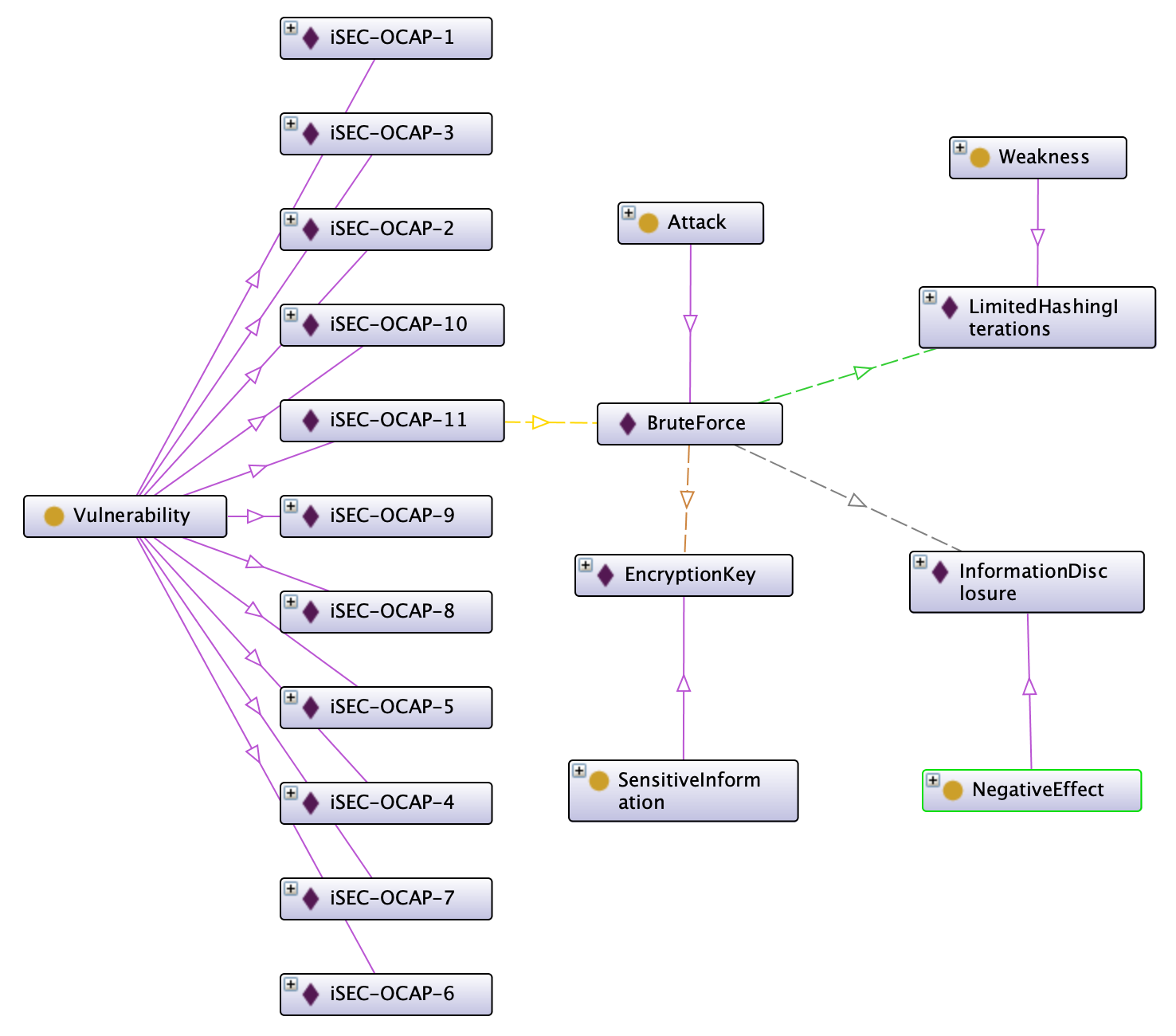 Attack, SensitiveInformation, Weakness, NegativeEffect, together with Function and Vulnerabilities, are top-level entities. For each entity there are multiple instances, for example, iSEC-OCAP-11 is an instance of Vulnerability and Brute Force is an instance of Attack. I connected the instances with relationships: iSEC-OCAP-11 is connected to Brute Force with the “uses” relation, and Brute Force is connected to Information Disclosure and Limited Hashing Iterations respectively with “causes” and “exploits”. Attached to some instances there are also properties to describe them. iSEC-OCAP-11 has vulnerabilityDifficulty=Medium and vulnerabilitySeverity=Medium.