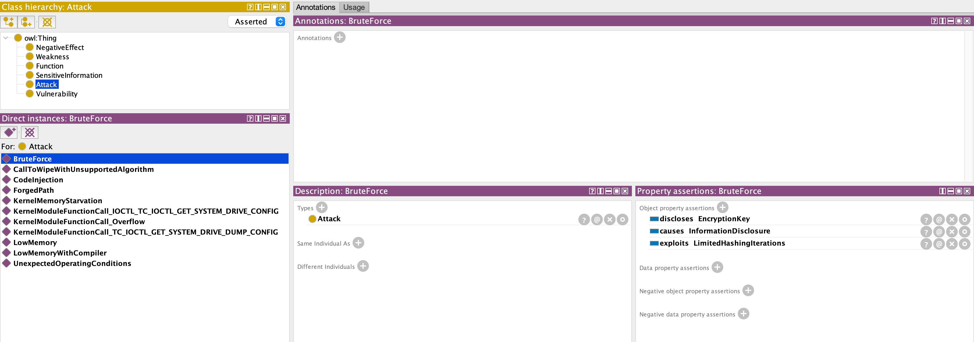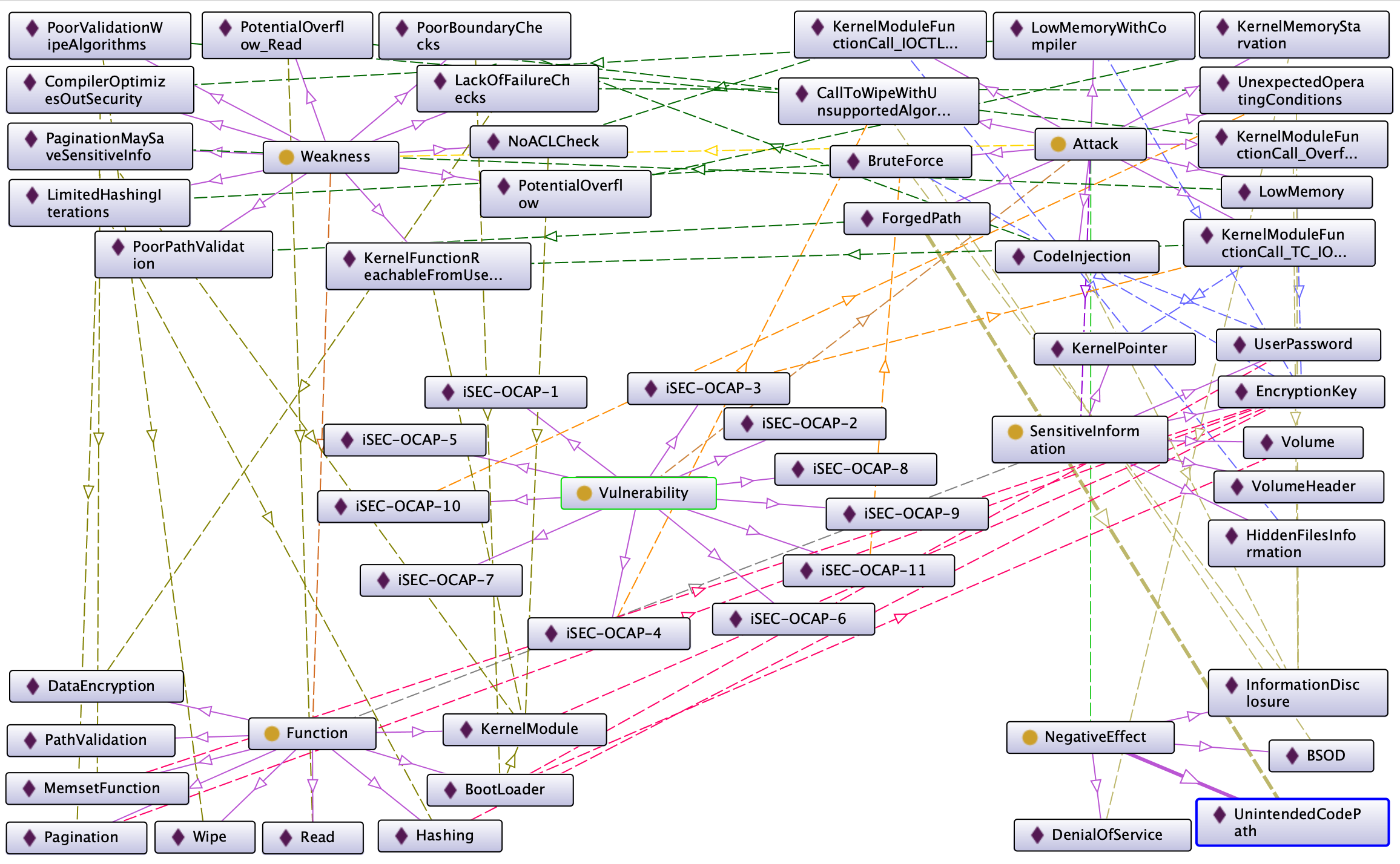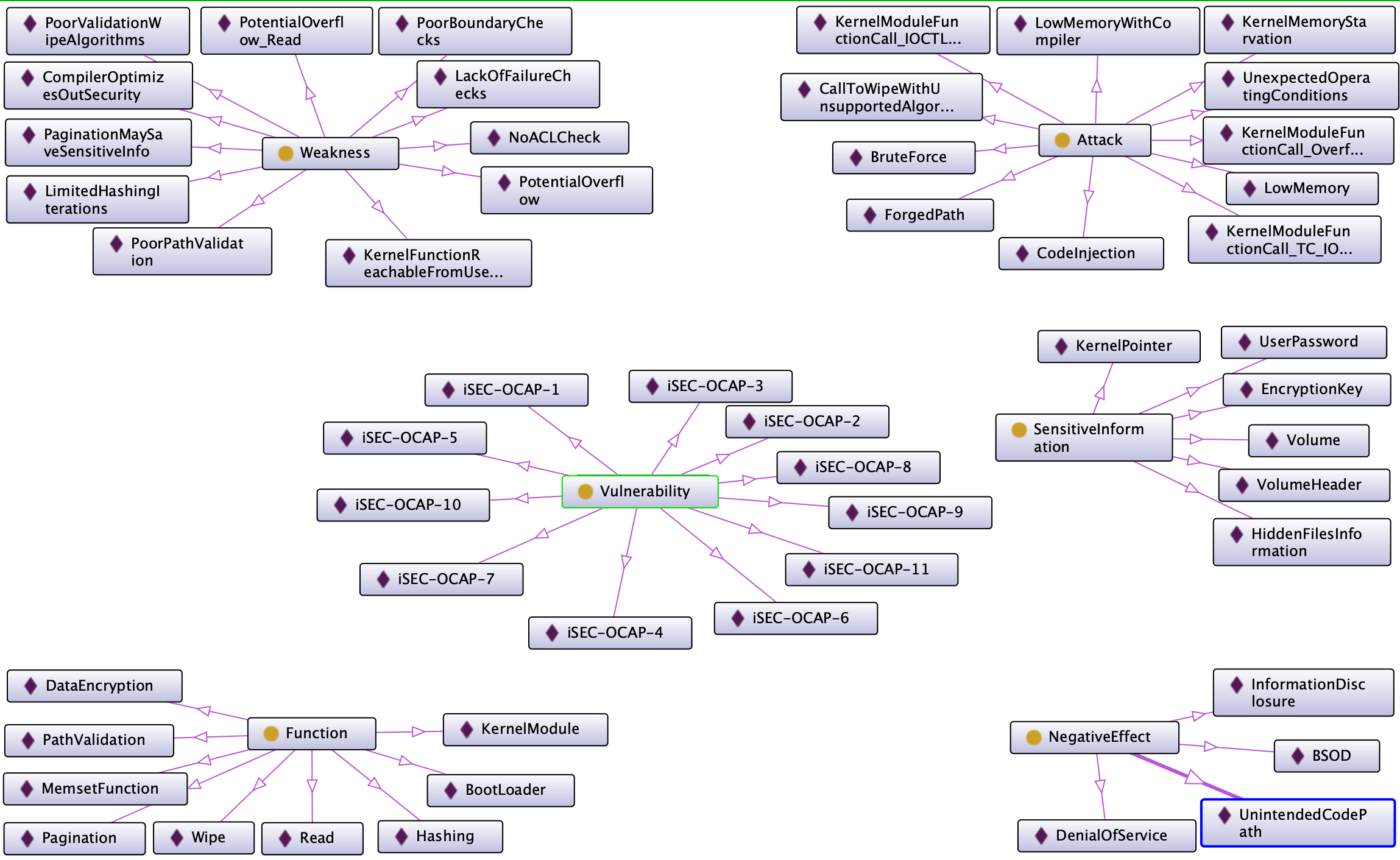 Attack, SensitiveInformation, Weakness, NegativeEffect, together with Function and Vulnerabilities, are top-level entities. For each entity there are multiple instances, for example, iSEC-OCAP-11 is an instance of Vulnerability and Brute Force is an instance of Attack. I connected the instances with relationships: iSEC-OCAP-11 is connected to Brute Force with the “uses” relation, and Brute Force is connected to Information Disclosure and Limited Hashing Iterations respectively with “causes” and “exploits”. Attached to some instances there are also properties to describe them. iSEC-OCAP-11 has vulnerabilityDifficulty=Medium and vulnerabilitySeverity=Medium.