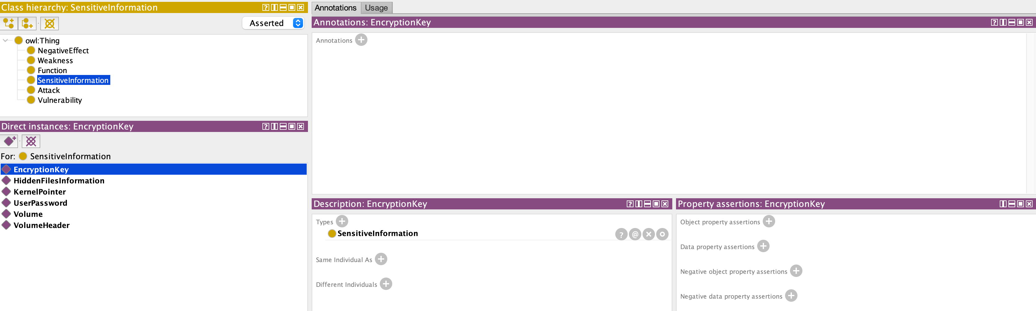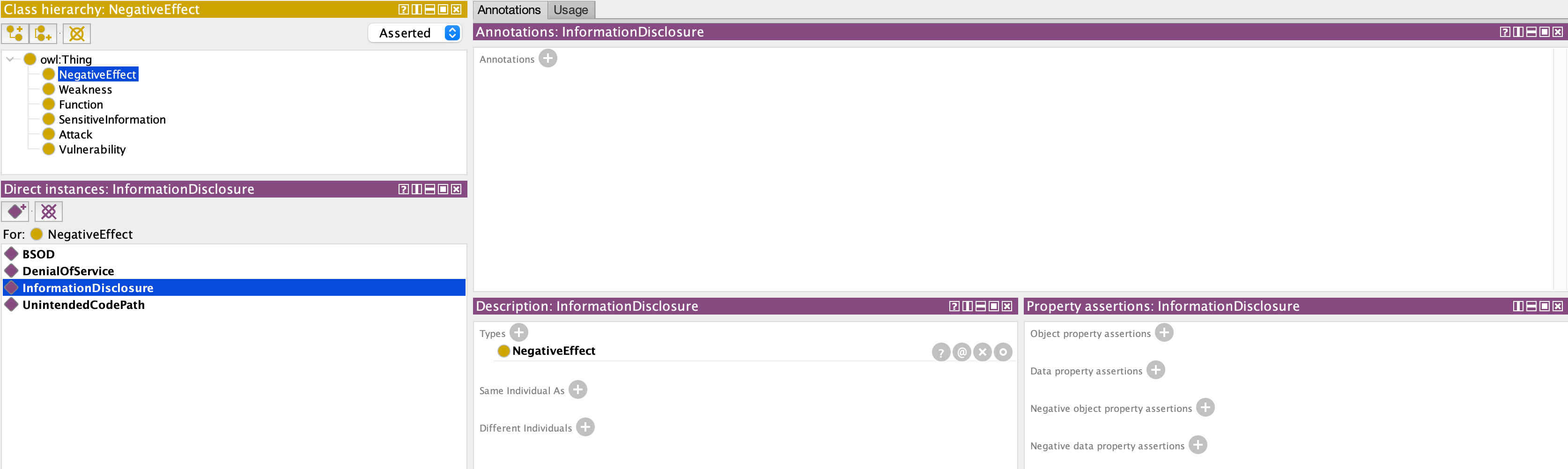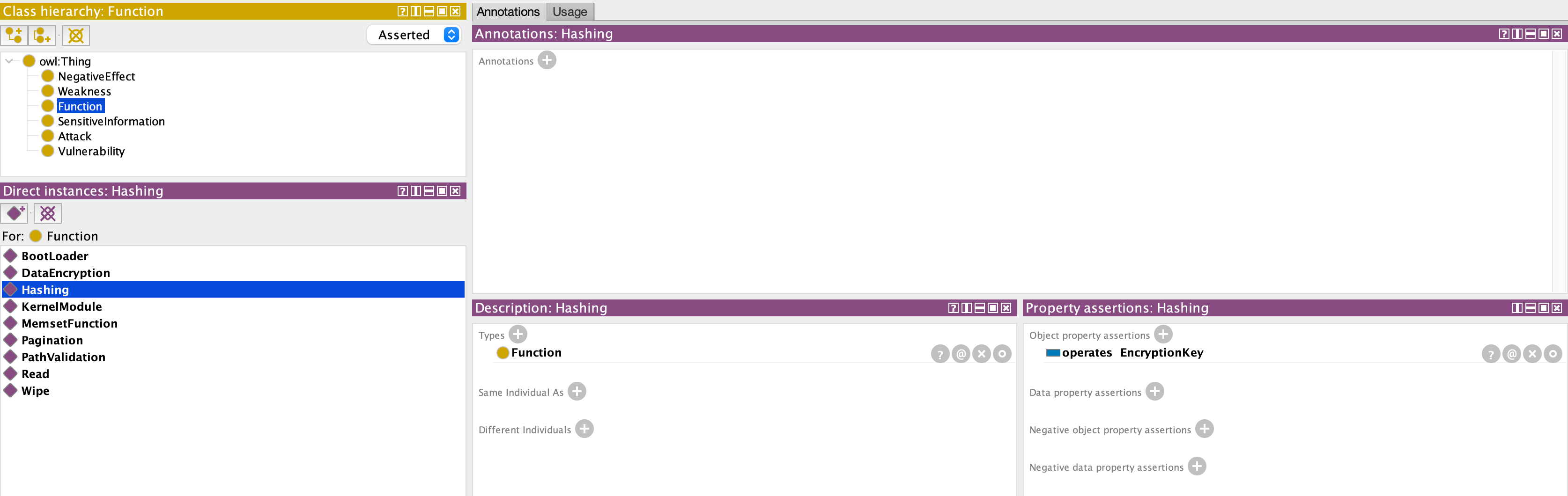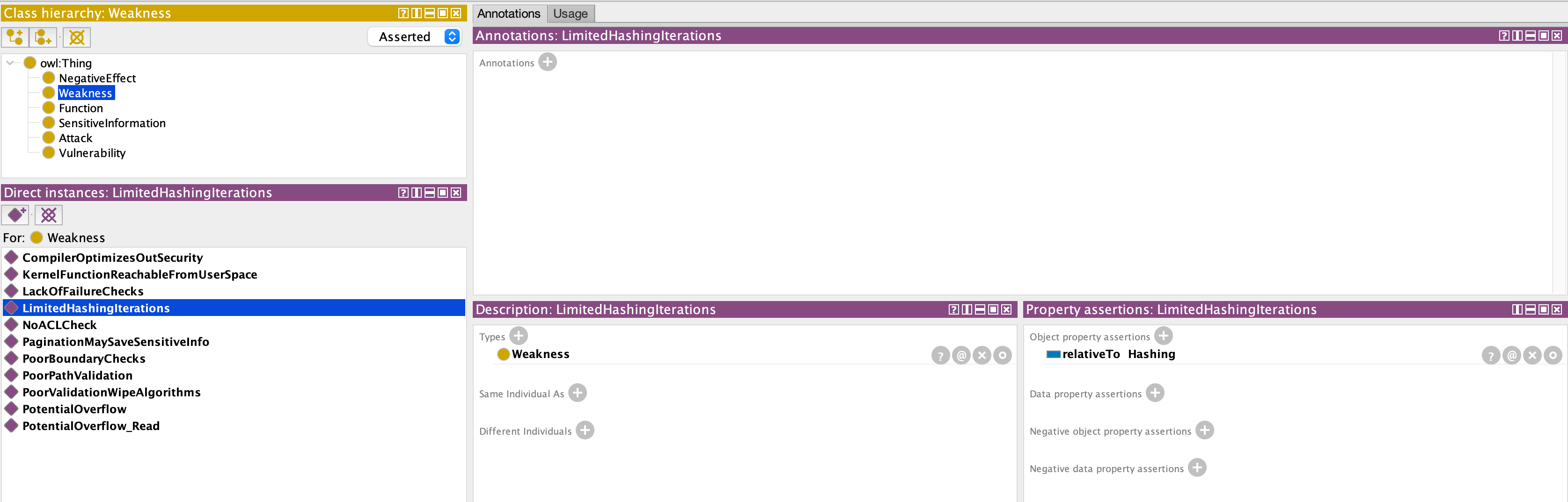 Attack, SensitiveInformation, Weakness, NegativeEffect, together with Function and Vulnerabilities, are top-level entities. For each entity there are multiple instances, for example, iSEC-OCAP-11 is an instance of Vulnerability and Brute Force is an instance of Attack. I connected the instances with relationships: iSEC-OCAP-11 is connected to Brute Force with the “uses” relation, and Brute Force is connected to Information Disclosure and Limited Hashing Iterations respectively with “causes” and “exploits”. Attached to some instances there are also properties to describe them. iSEC-OCAP-11 has vulnerabilityDifficulty=Medium and vulnerabilitySeverity=Medium.