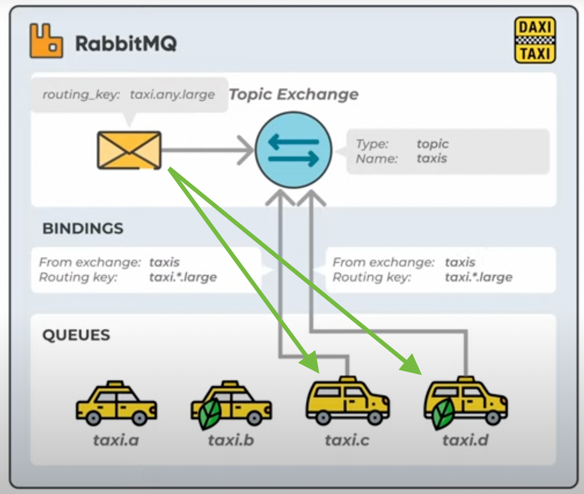 RabbitMQ differs from brokers such as ActiveMQ because it uses a level of indirection between the producer and a consumer. The exchanges implement such indirection similarly (but not quite the same!) to how post offices are in the middle between who sends a postcard and who receives it.